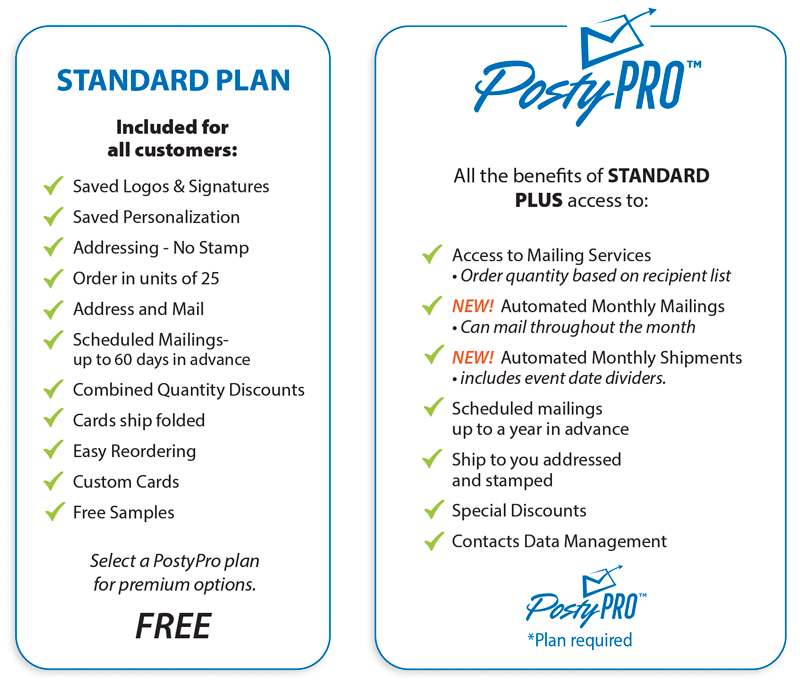 A PostyProâ„¢ plan is required for automations. Plans are based on annual mailing service usage. Plan prices are low and offset by discounted mailing services.
